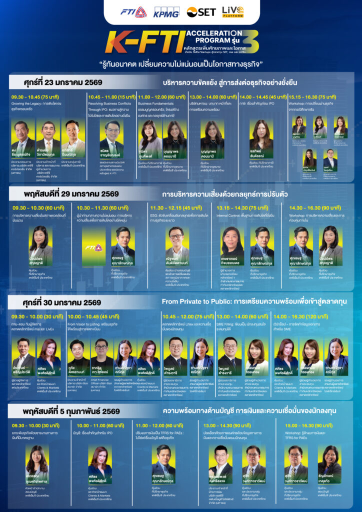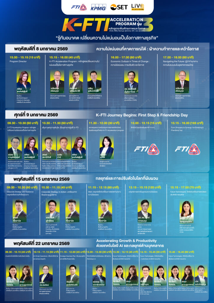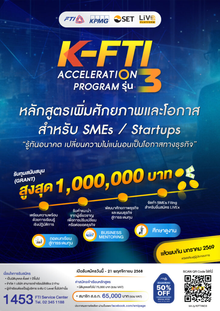 สภาอุตสาหกรรมแห่งประเทศไทย (ส.อ.ท.) จับมือกับ ตลาดหลักทรัพย์แห่งประเทศไทย และ เคพีเอ็มจี ประเทศไทย ประกาศเปิดรับสมัครผู้ประกอบการ SMEs และ Startups เข้าร่วมโครงการ “K-FTI Acceleration Program รุ่นที่ 3” หลักสูตรเร่งรัดเพื่อเสริมศักยภาพและเปิดประตูสู่แหล่งทุนอย่างมีประสิทธิภาพ ภายใต้แนวคิด “รู้ทันอนาคต เปลี่ยนความไม่แน่นอนเป็นโอกาสทางธุรกิจ”