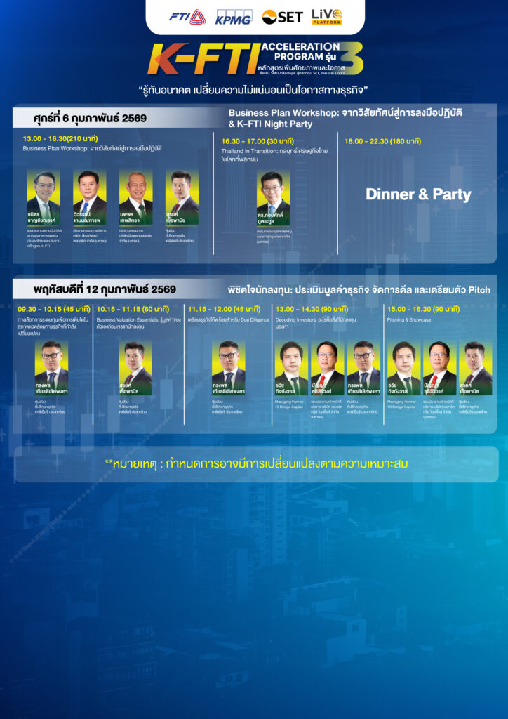 ด้วยเหตุนี้ ส.อ.ท. จึงได้ร่วมกับพันธมิตรผู้เชี่ยวชาญ จัดทำหลักสูตร K-FTI Acceleration Program ขึ้น เพื่อพัฒนาผู้ประกอบการให้มีความพร้อมสำหรับการระดมทุนในทุกรูปแบบ ไม่ว่าจะเป็นในตลาดทุน (LiVE Exchange, mai, SET) หรือการร่วมลงทุนกับนักลงทุนเชิงกลยุทธ์ (Venture Capital และ Corporate Venture Capital)