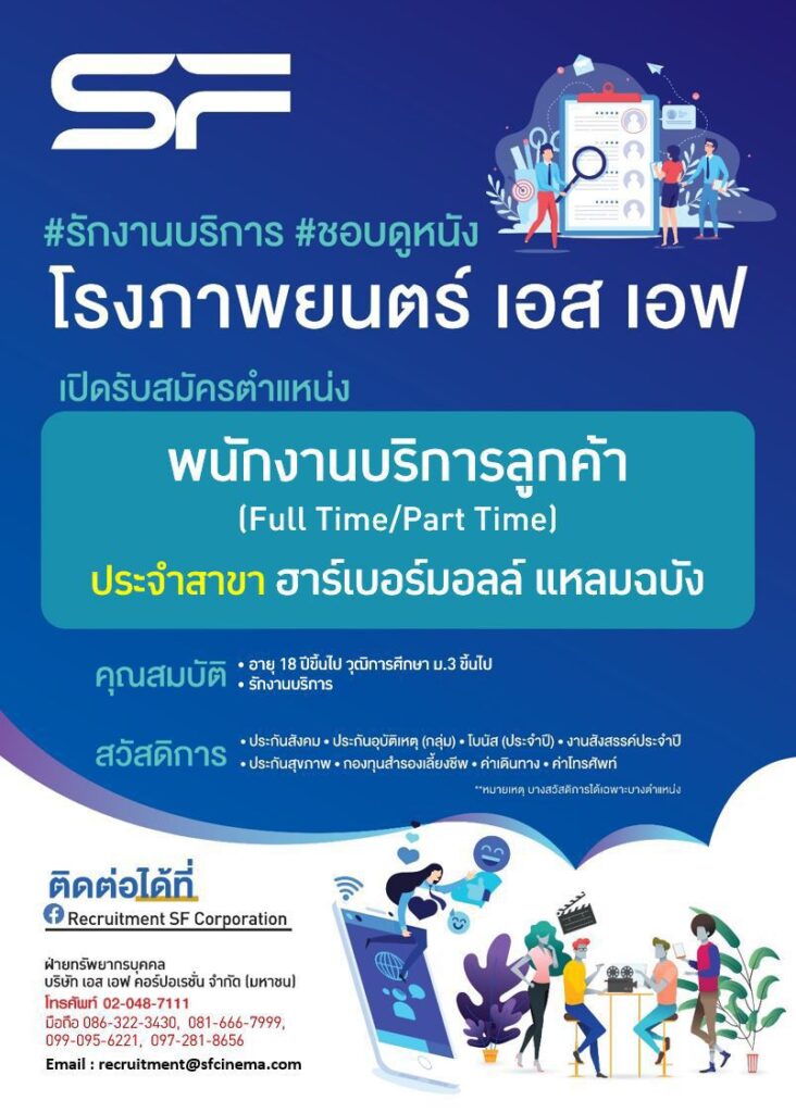 โรงภาพยนตร์ เอส เอฟ ซีเนม่า (SF Cinema) สาขาฮาร์เบอร์มอลล์ แหลมฉบัง ประกาศเปิดรับสมัครพนักงานเข้าร่วมทีมในตำแหน่ง “พนักงานบริการลูกค้า (Part-Time)” เพื่อรองรับการให้บริการและสร้างประสบการณ์ที่ดีให้กับผู้ที่เข้ามาชมภาพยนตร์